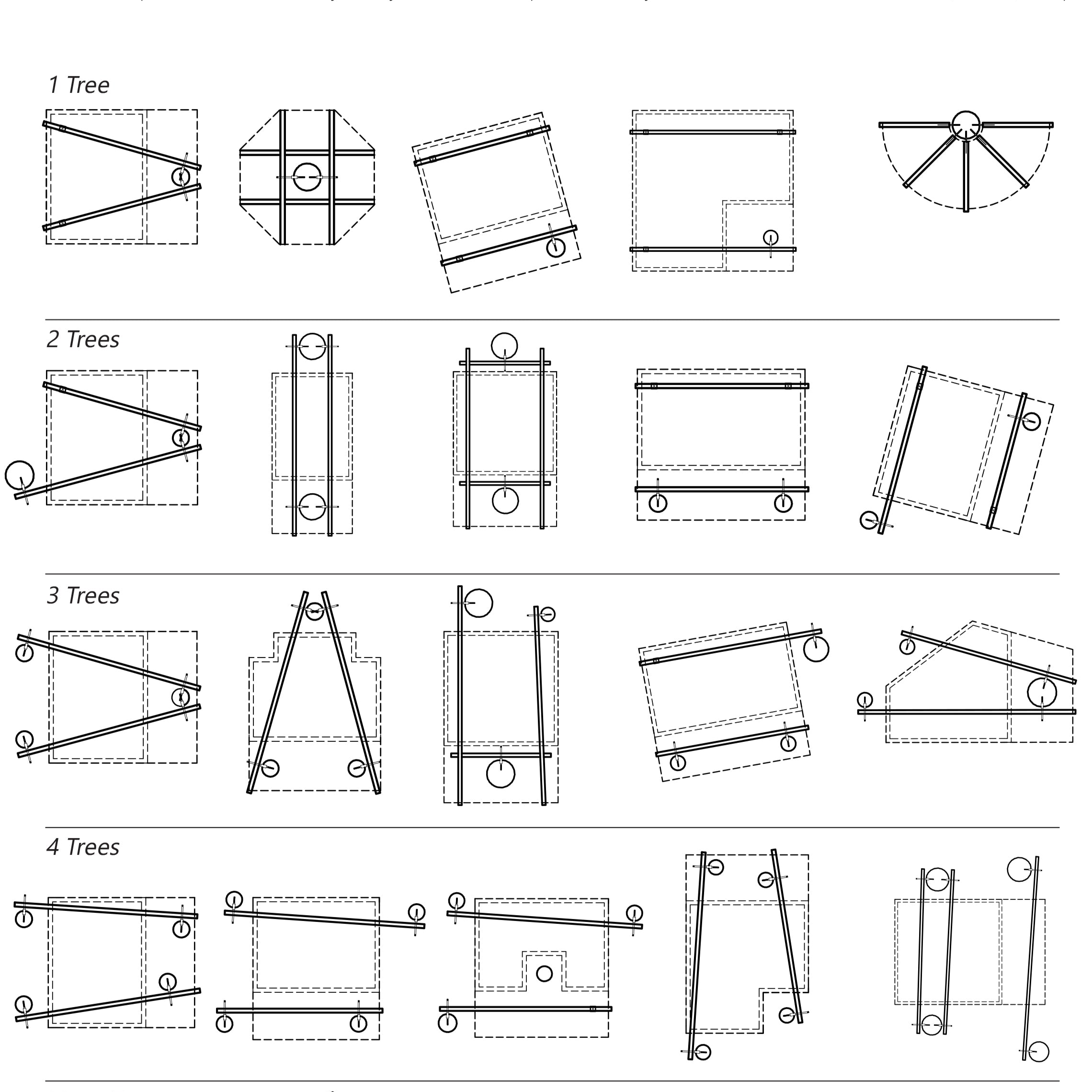 These examples illustrate common layouts for beams and platforms, featuring various combinations of trees, beams, & posts.