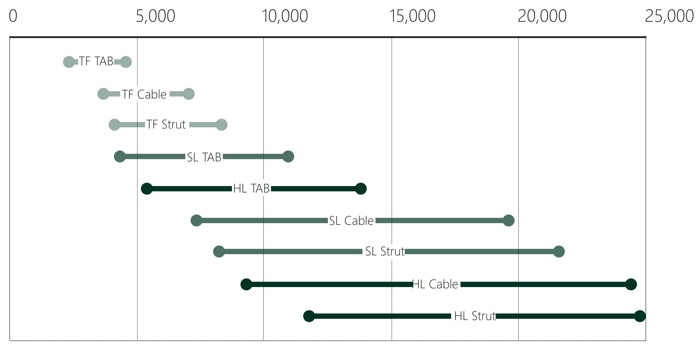 We have 3 different treehouse hardware systems: Tree Fort (TF), Standard Limb (SL) and Heavy Limb (HL). When installed correctly and backed up with either a Cable or a Strut, this treehouse hardware is incredibly strong, as shown below: