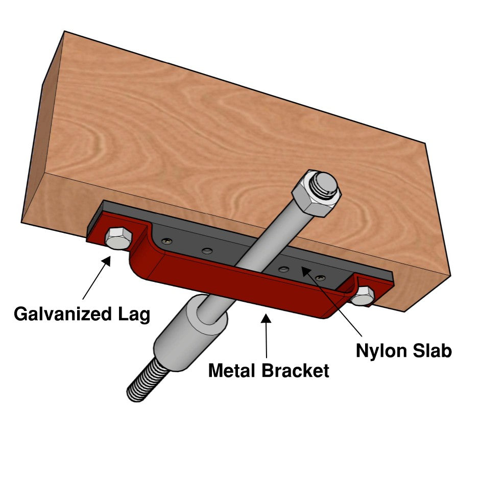 To achieve the dynamic movement in the trees, a Nylon Slab is placed in between the TAB and beam. The TAB is then secured with a Metal Bracket using (2) 5/8”x4” Galvanized Lags.